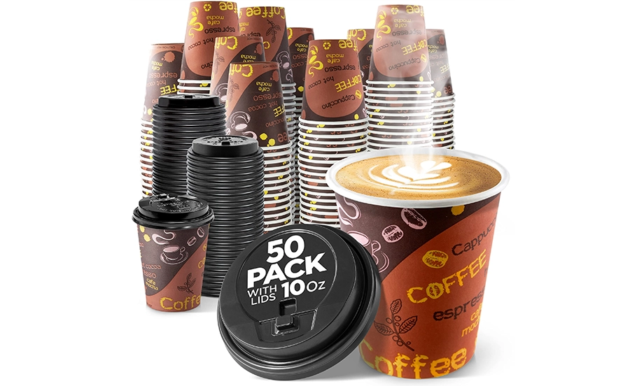 10 oz Disposable Coffee Cups with Lids, 50-Pack