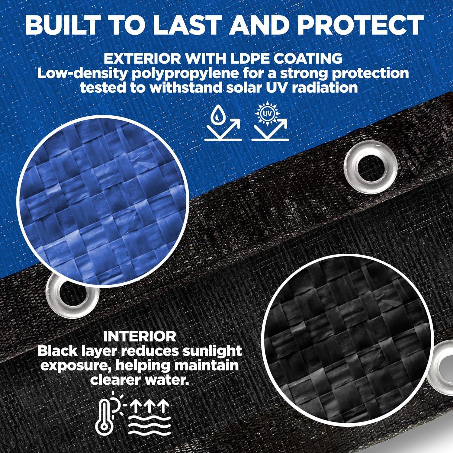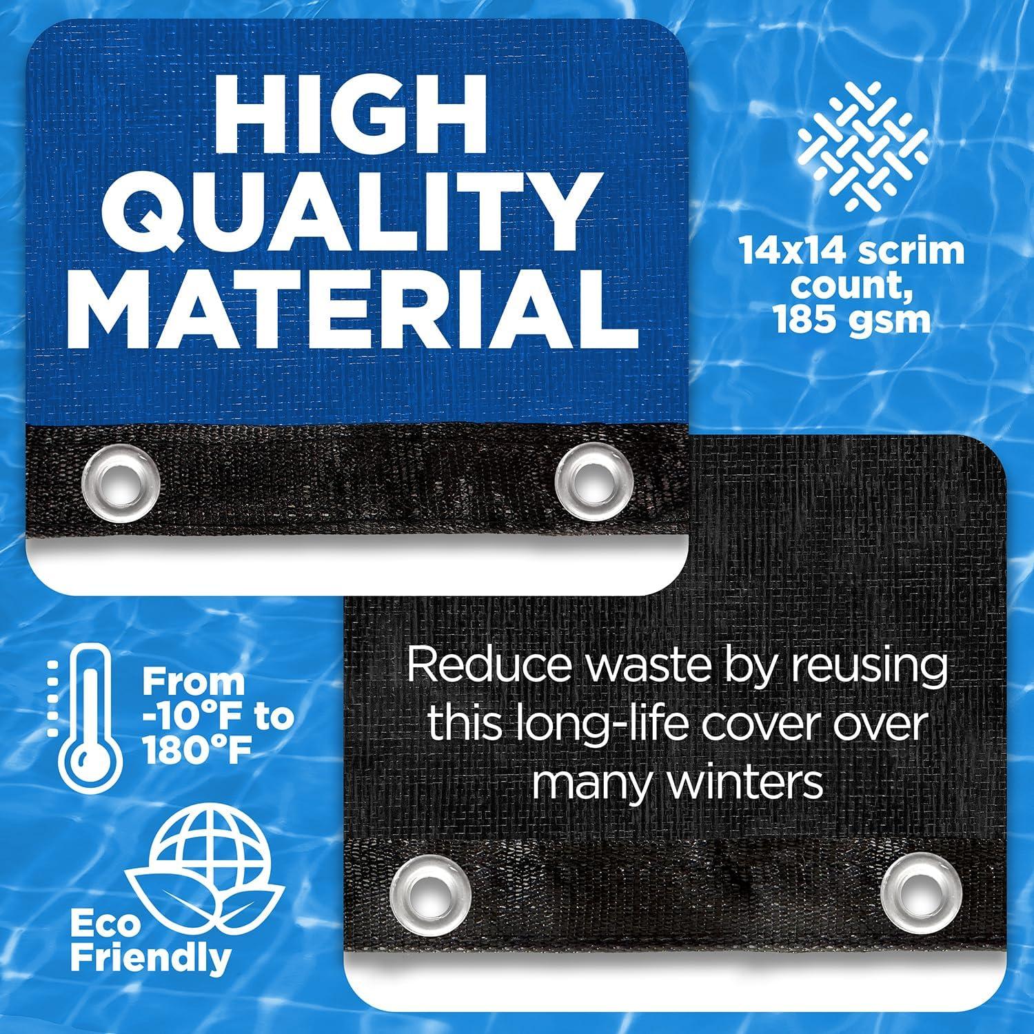 Heavy-Duty Durability: Crafted with premium materials and engineered with an industry-leading 14 x 14 scrim count and a density of 185 gsm, our above ground pool covers are built to withstand the harshest of winters. The extra sealing seams effectively keep debris out, ensuring long-lasting protection for your pool.