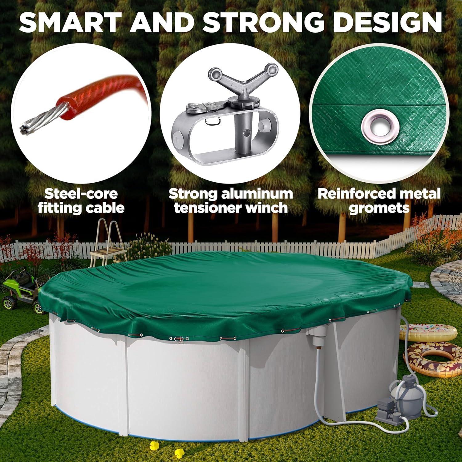 EXTRA DURABLE CONSTRUCTION: Crafted from premium mesh material with a 10×10 scrim count, our above ground pool covers deliver superior strength and durability. Engineered to withstand harsh winter elements, they offer long-lasting protection season after season.