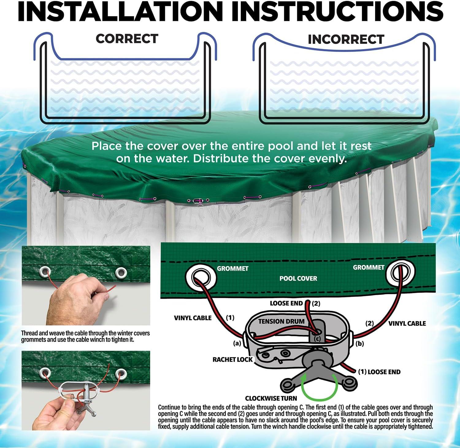 EXTRA DURABLE CONSTRUCTION: Crafted from premium mesh material with a 10×10 scrim count, our above ground pool covers deliver superior strength and durability. Engineered to withstand harsh winter elements, they offer long-lasting protection season after season.