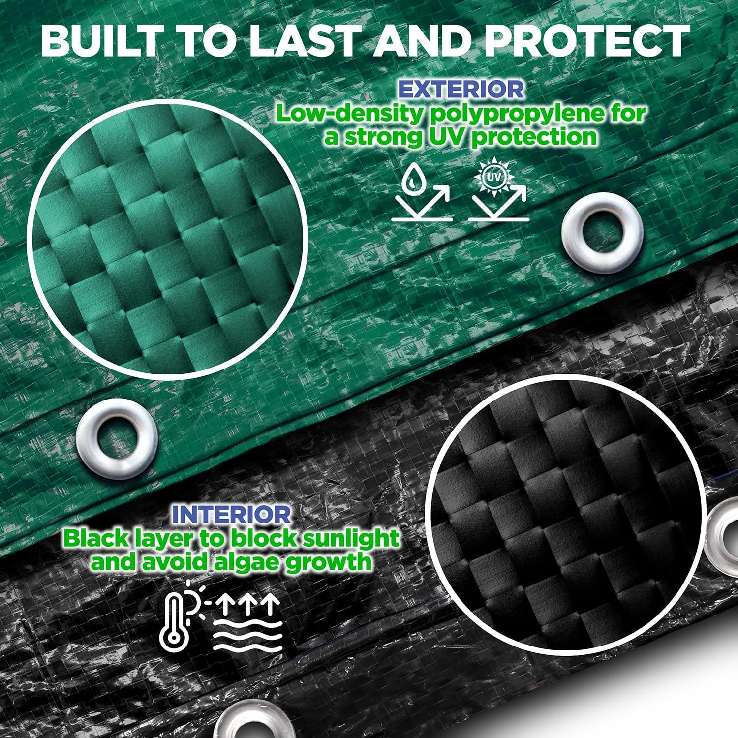 YEAR-ROUND SUN AND UV DEFENSE: Built to block harmful UV rays and reduce sun damage, this pool cover for above ground pools protects your pool in both hot summers and frigid winters. Heat-sealed seams further enhance its UV resistance for added longevity.