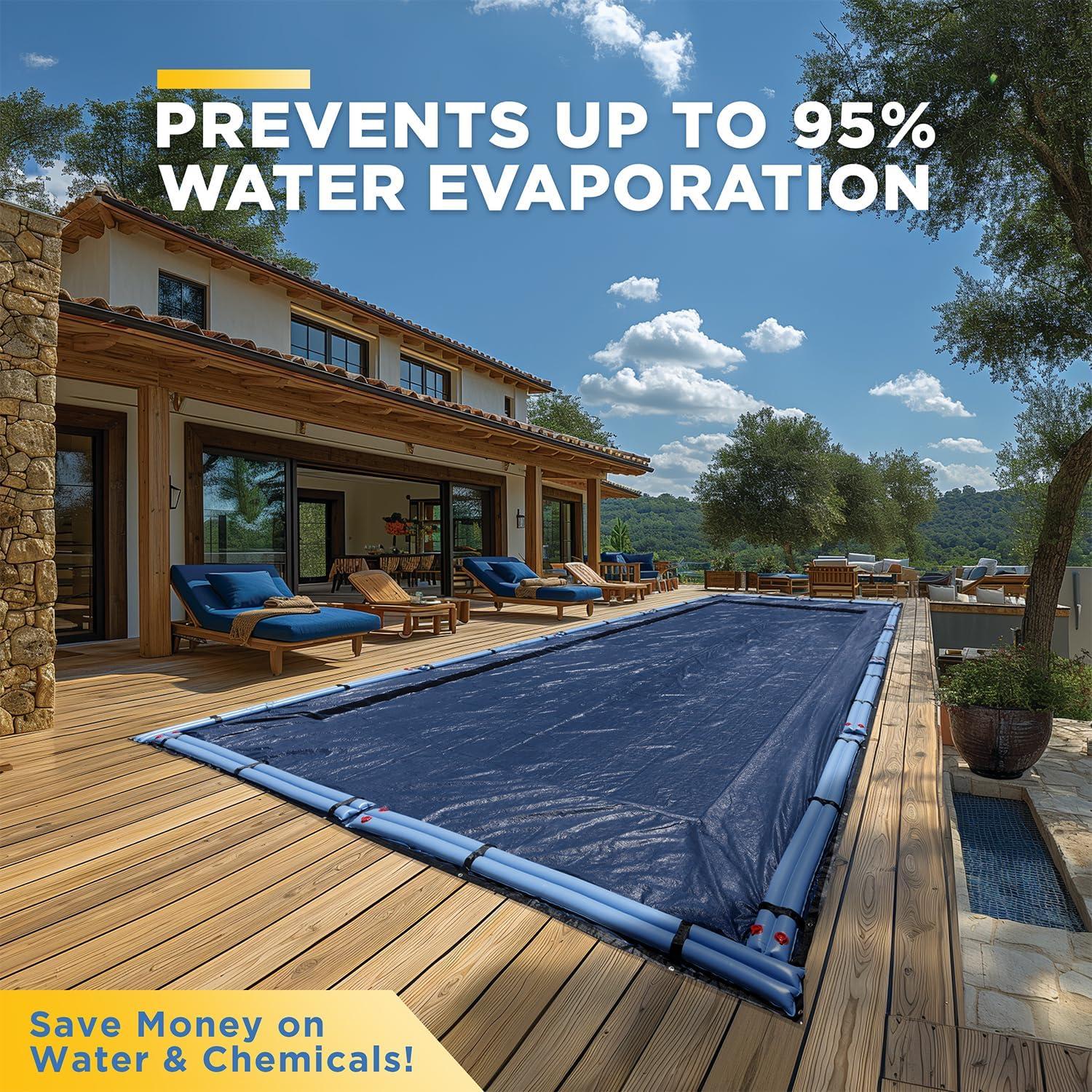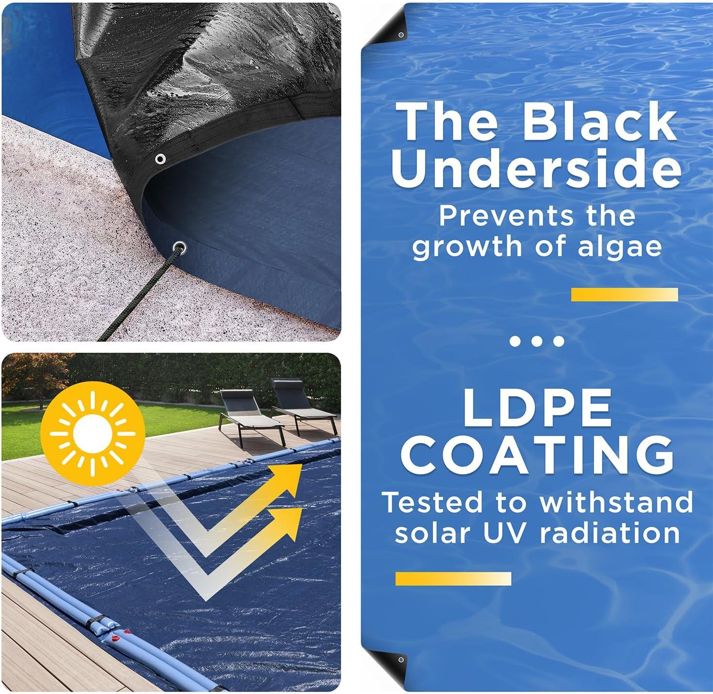 Year-Round UV Protection: Our pool cover is designed to provide exceptional protection against sunlight and harmful UV rays throughout the summer and winter months. The cover also features heat sealed seams.