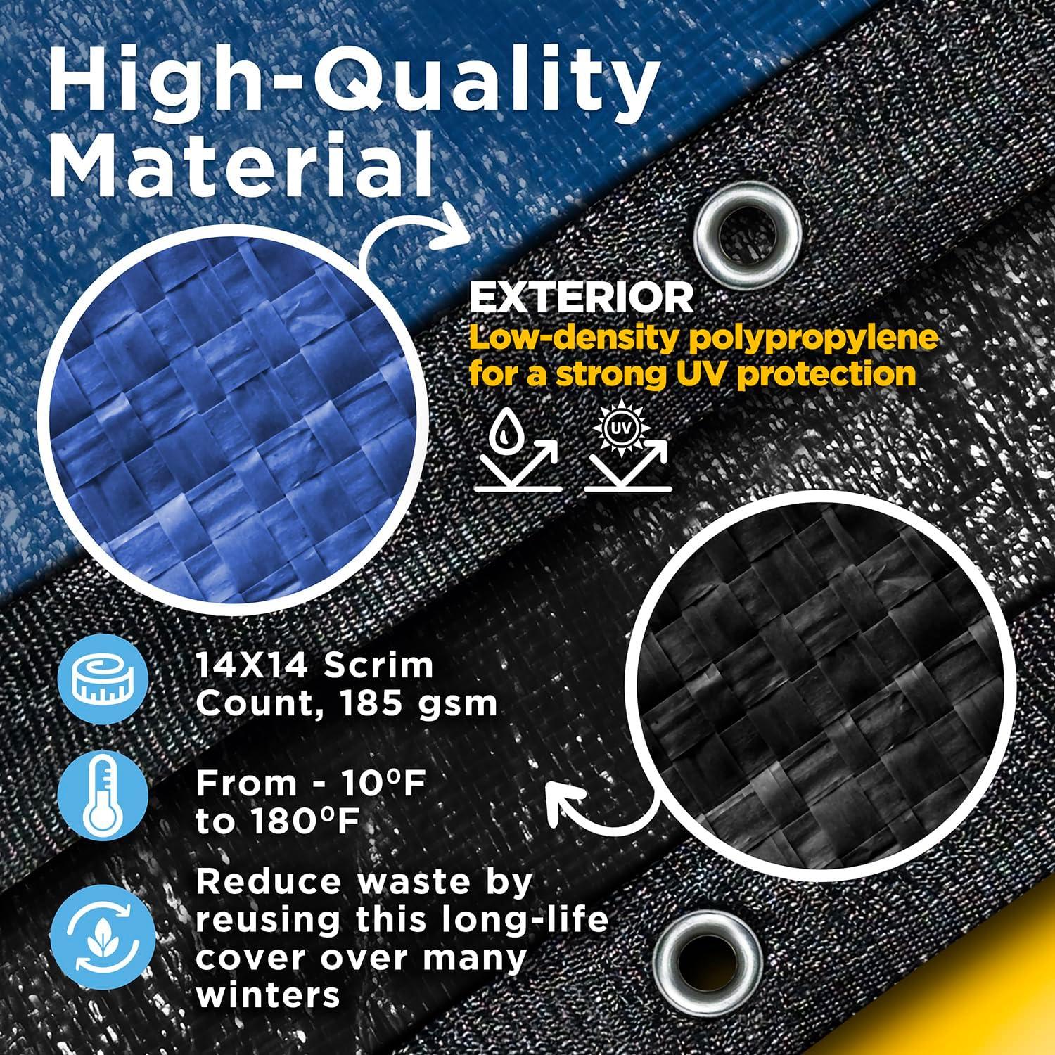Year-Round UV Protection: Don't let the winter fool you—UV radiation remains strong even in the colder months. Our above ground pool covers provide comprehensive protection all year long. Featuring an LDPE coating that can withstand solar UV radiation, these covers effectively shield your pool from harmful rays. The black underside reduces sunlight exposure to the water, helping maintain clearer water.