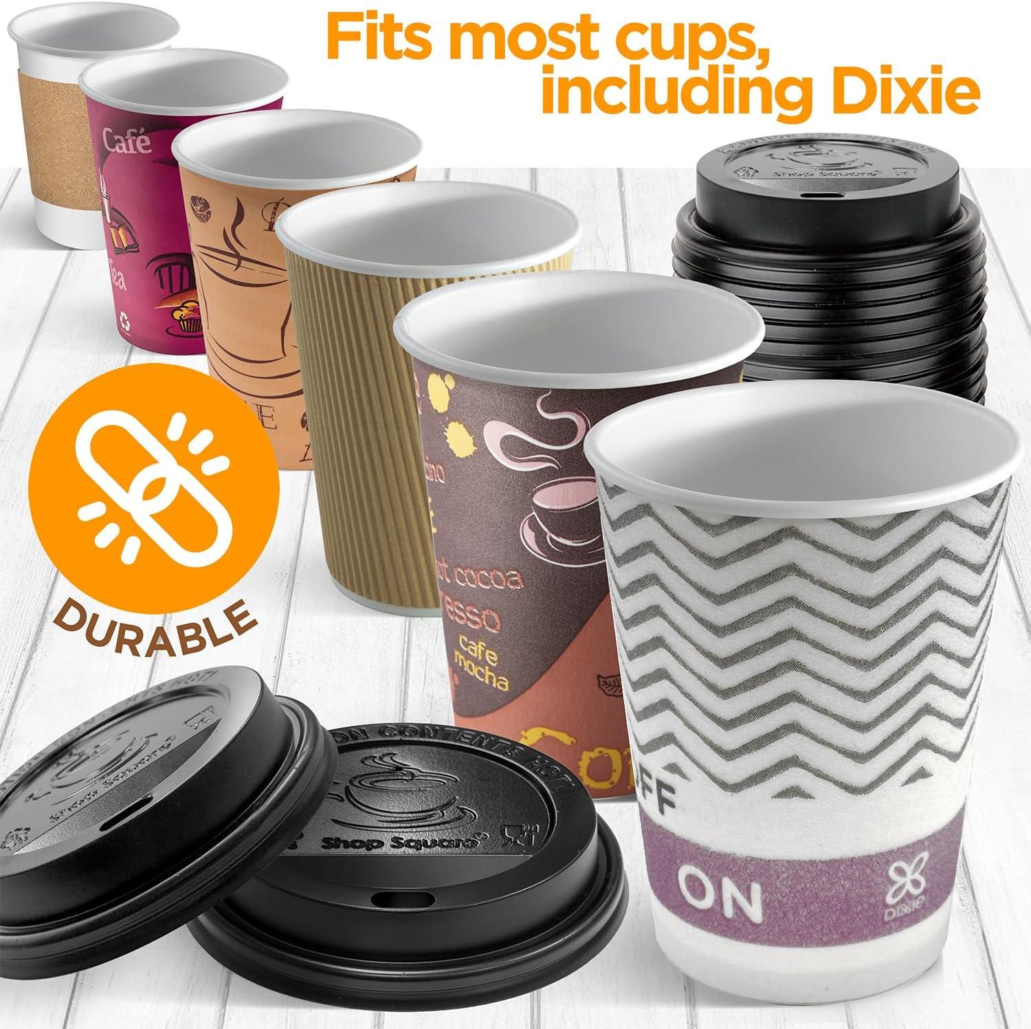 One Size Fits All – These versatile coffee cup lids are compatible with different disposable cup sizes. These include 10, 12, 16, 20, and 24oz coffee paper cups and 8 oz. squat cups.