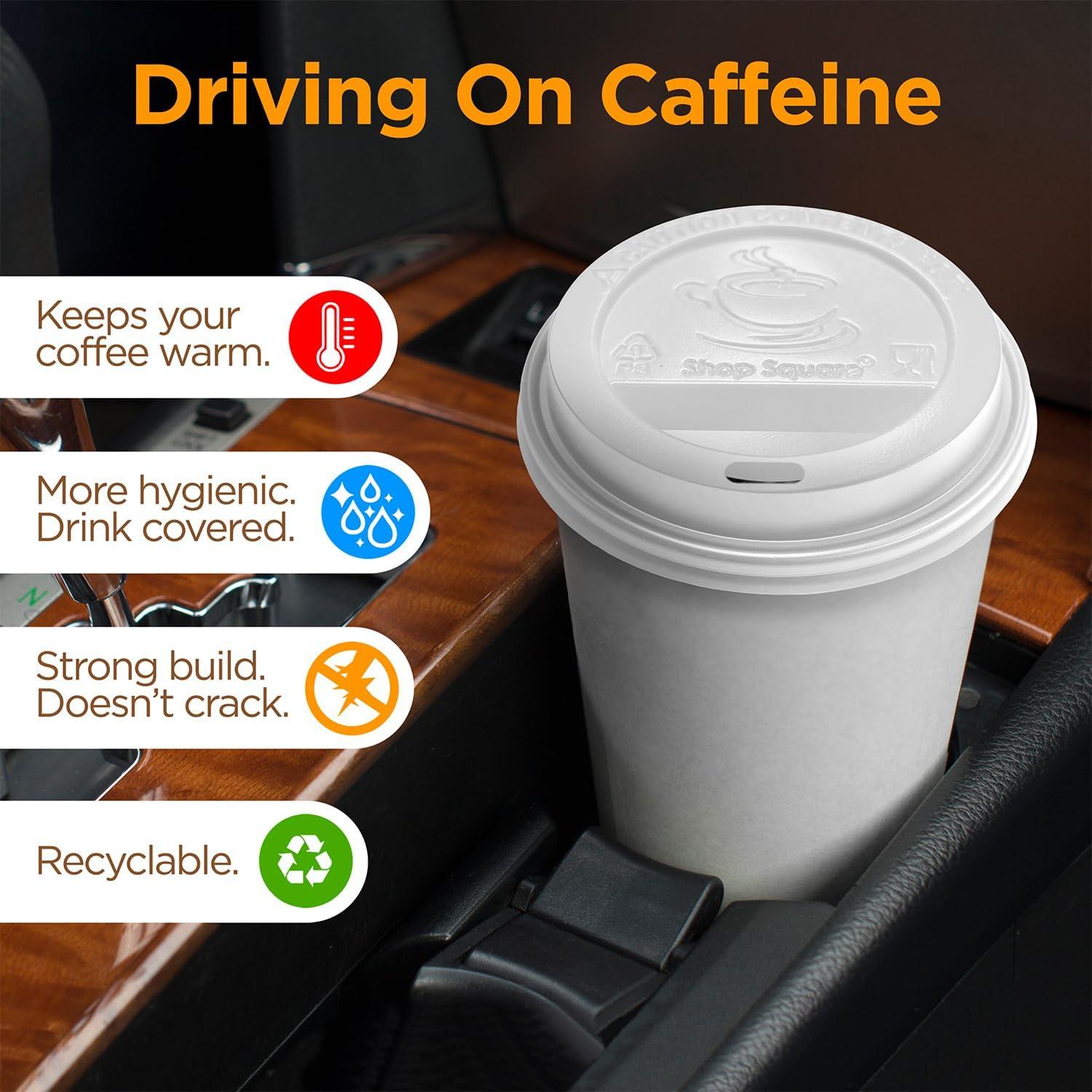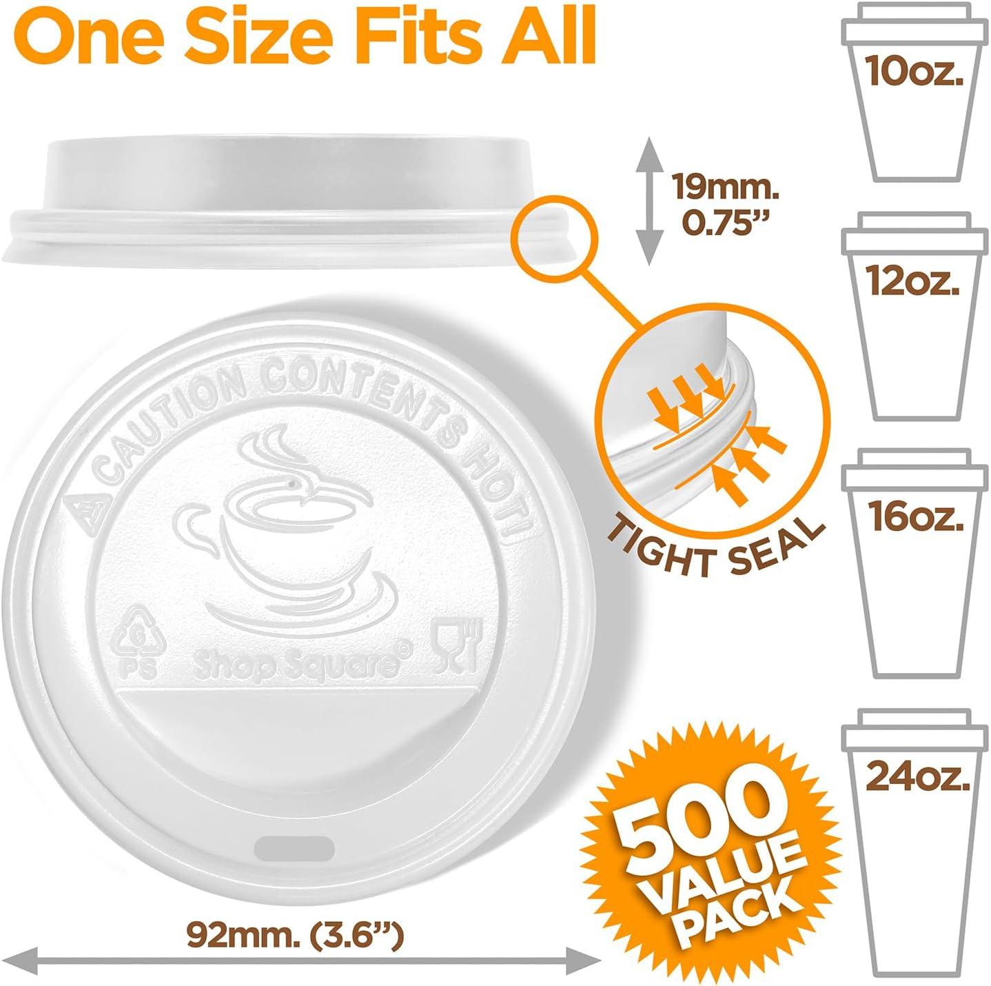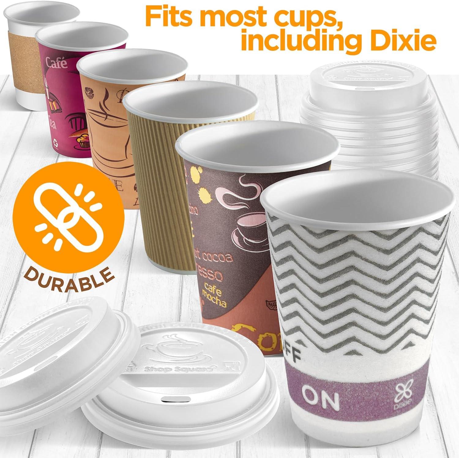 One Size Fits All – These versatile coffee cup lids are compatible with different disposable cup sizes. These include 10, 12, 16, 20, and 24oz coffee paper cups and 8 oz. squat cups.
