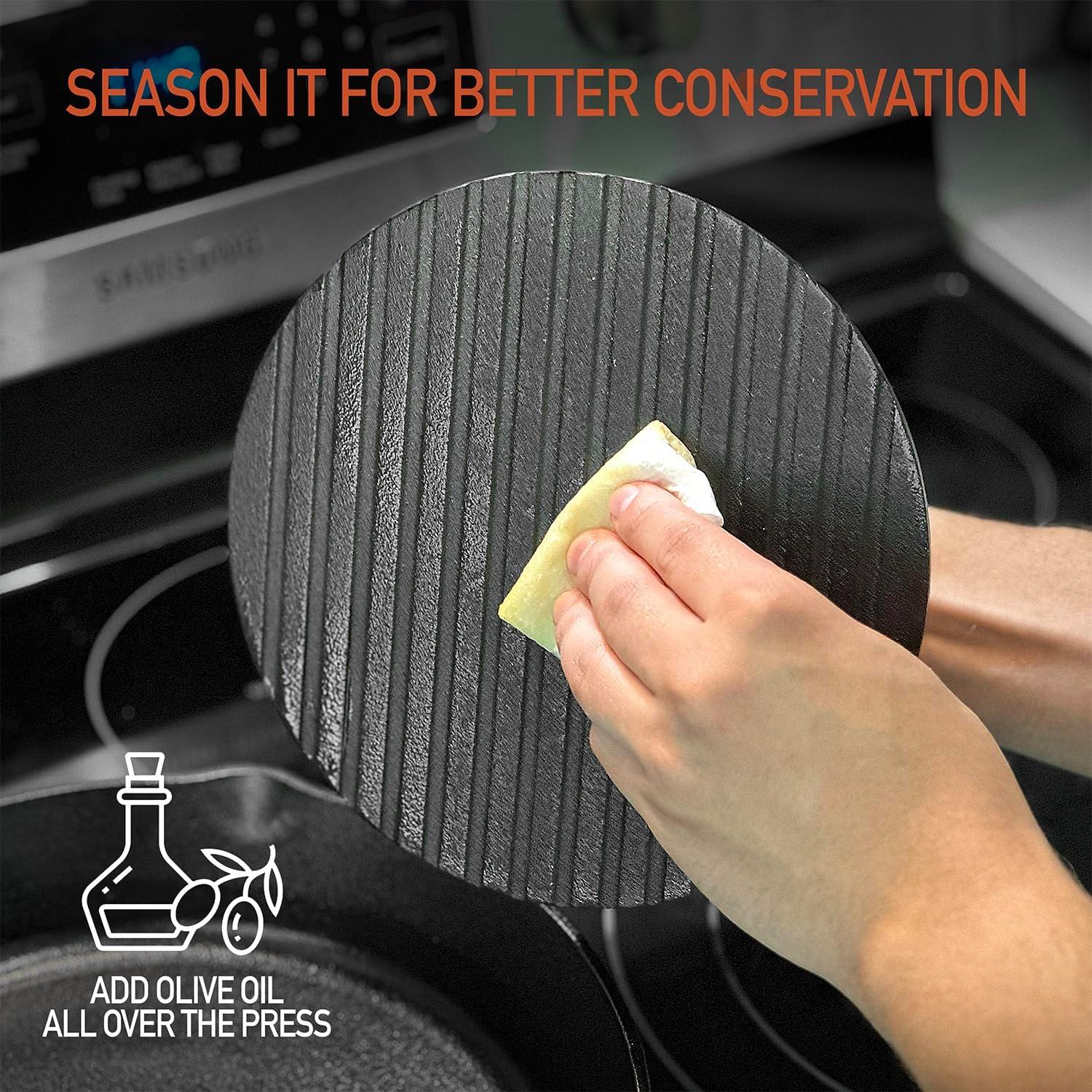 Heavy-Duty Cast Iron Construction: Built to last with durable and food-grade construction, our cast iron grill press is a reliable tool for any kitchen. The sturdy cast iron material is resistant to rust and wear, ensuring that it will serve you for years to come, even with frequent use.
