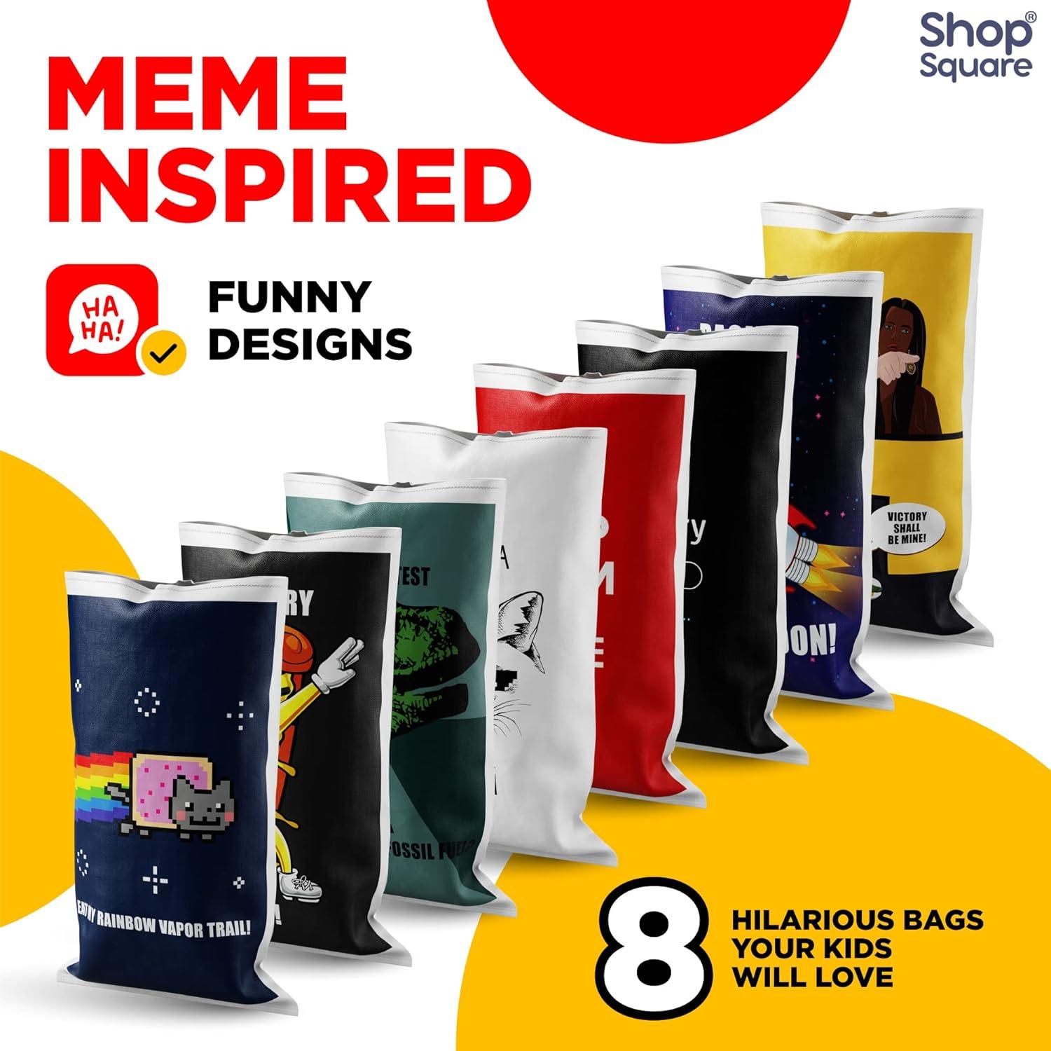 Did someone say memetastic potato sack race? Yard games will never be the same after hopping around in these funny, unique, potato sacks. Add nyan cat, a dabbing pizza, and more to your collection of kids party games. Remember, there are 8 different designs, but only one race winner! These bags are huge! At 23’’ x 40’’, they can easily fit both adults and kids. Family yard games will never be the same. A party pack of 8 unique jumping sacks means everyone can join in on the race. Adults want to have fun too! You will be using these potato sack race bags a lot, but don’t worry, they are very durable and strong. Made from interwoven plastic, they won’t rip or tear and can be used for many years to come. Waterproof, they won’t fade and will look great for all of your outdoor adventures. You can even use them for storage when the races are over. Become the king and queen of kids party games with this hilarious set of potato sack race bags. They are perfect for birthday parties, bbqs, picnics, family reunions, or holiday parties.