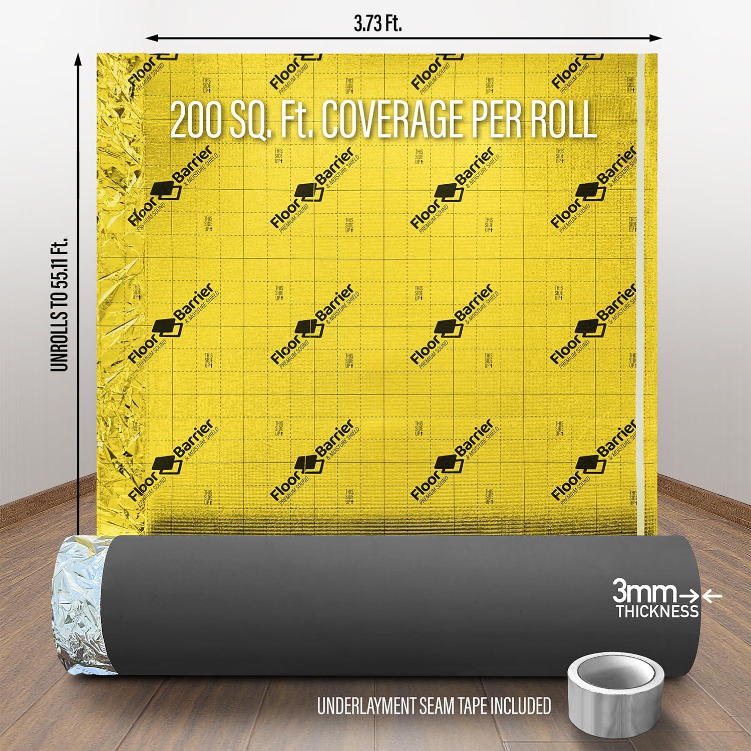 COVERS LARGE AREAS – Each roll of this flooring underlayment covers 200 sq ft and is 3 mm thick, providing a thick underlayment layer with an integrated moisture barrier for enhanced floor protection.