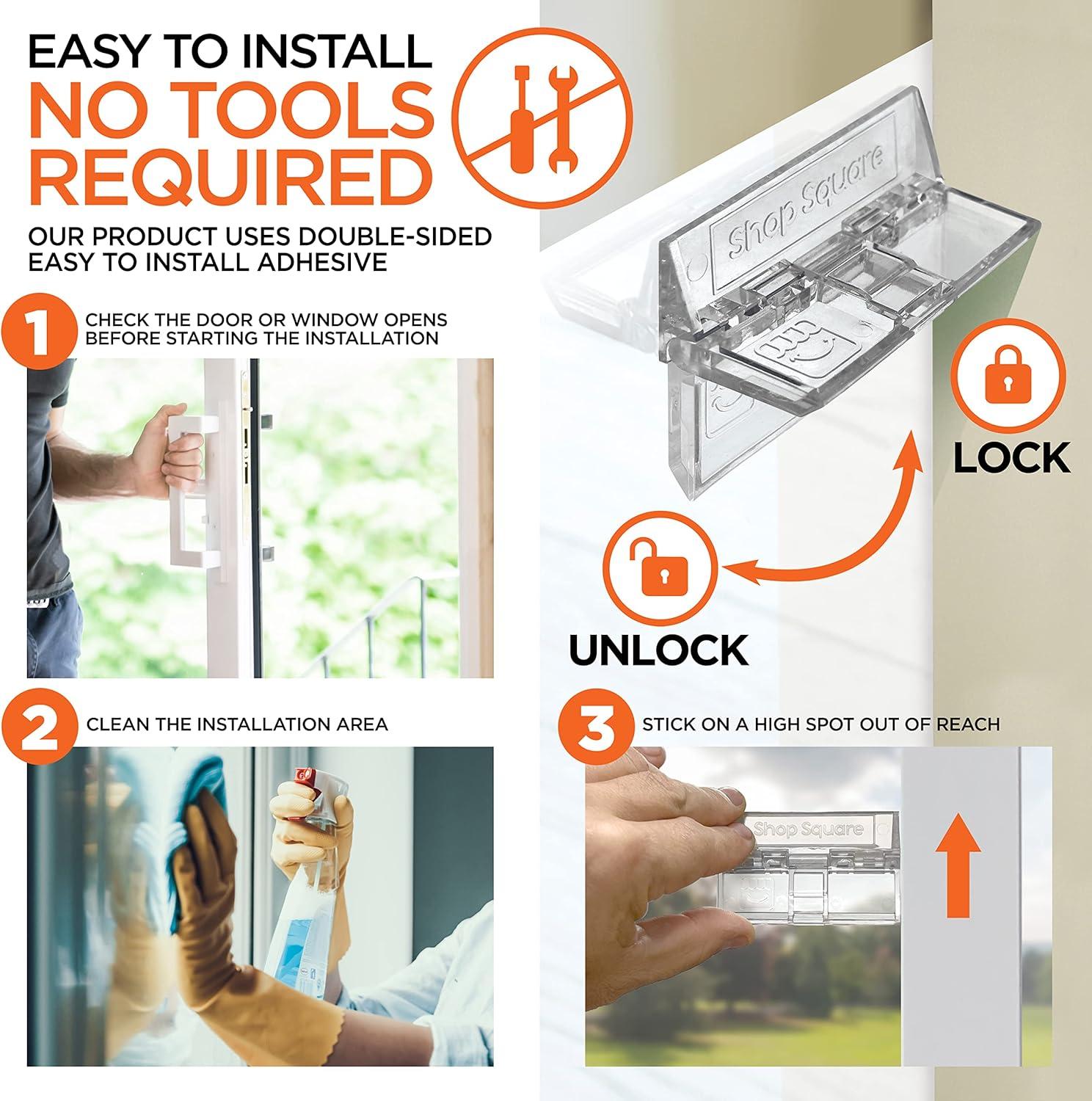 EASE OF USE: Install our patio door lock quickly and easily without any tools necessary using double-sided, easy install/removal adhesive. Just peel and press for a strong, lasting hold for your window stopper. Easy for adults but impossible for children and pets, the sliding door lock is easily lifted with a finger to lock and simply pressed down to unlock.