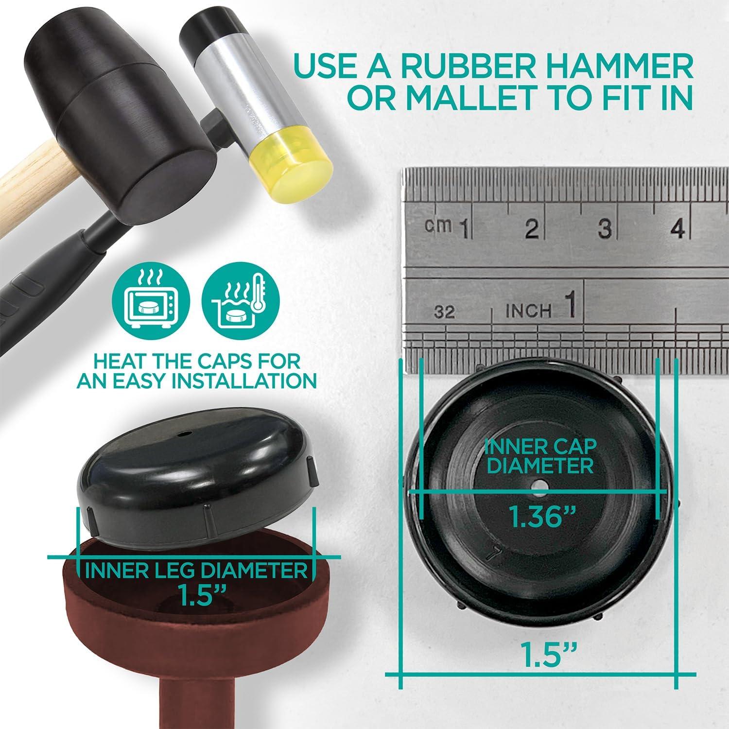 A Breeze To Install – These round caps are meant to fit snugly onto chair legs with an inner diameter of 1.5”. Simply pop them into your furniture’s feet and hit using a rubber hammer or a mallet.